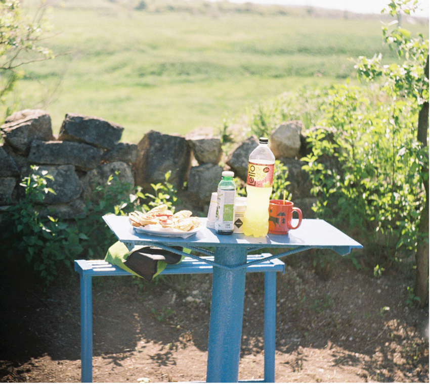 Om de zoveel tijd komt er iemand langs met een mineraalwaterfles van het merk Gura, vol met huiswijn. Er gaat één glas rond, en om beurten proeven we alle soorten wijn die er in de wijde omtrek worden gemaakt. Dit zijn eenvoudige wijnen, elk weliswaar totaal anders dan de andere, maar tegelijkertijd met eenzelfde karakter – een tekort, al is dat het verkeerde woord, aan de gesofisticeerde, in laboratoria ontwikkelde gisten, waardoor druivendrank opeens naar sinaasappel kan gaan smaken, of naar lente en dennenbos.