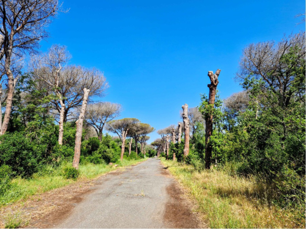 Ik rijd onder bruin verdroogde koepels waar ze eerder trots hun takken spreidden met frisgroene naalden, pijnboomappels en daarin de exquise pijnboompitten. Het is een triest gezicht.