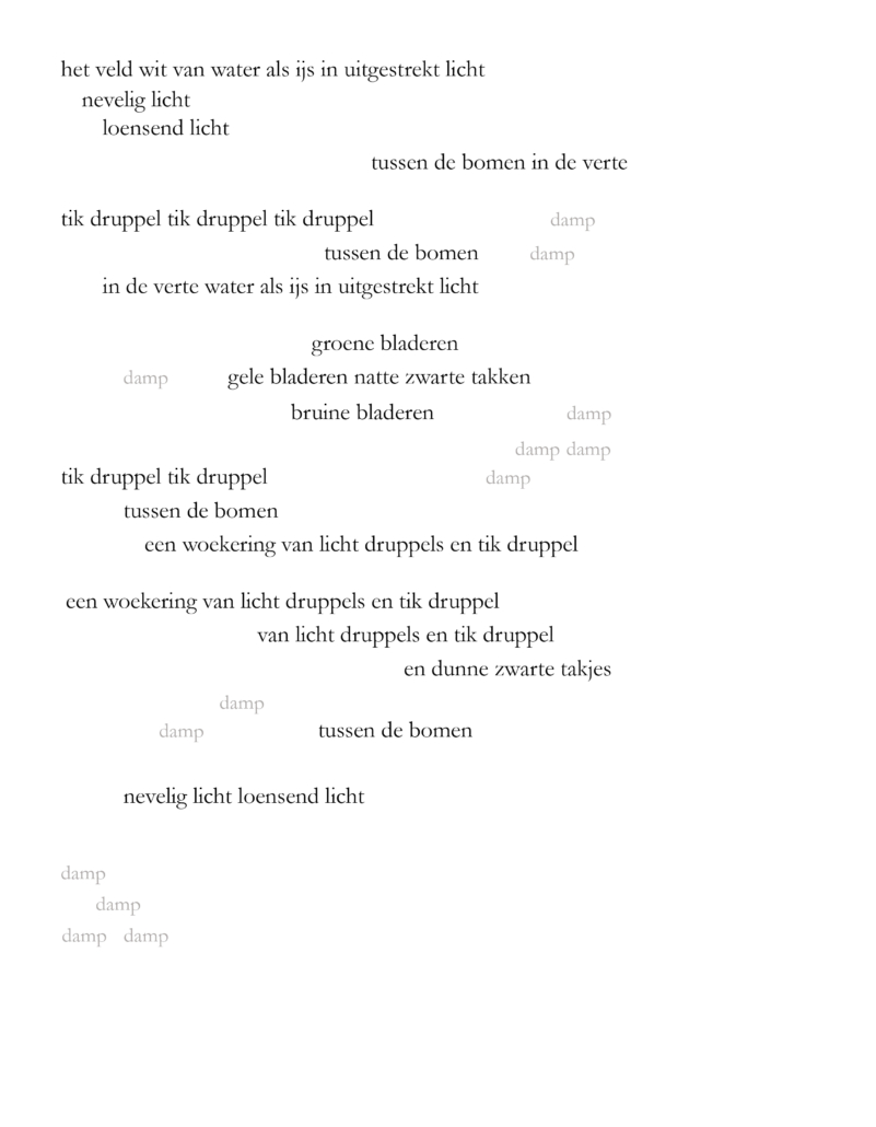 Onder bomen en wild woekerende struiken ontwaar ik regelmatig min of meer omsloten plekken die voor insecten, zoals springstaarten en mieren, een volledig universum vormen; een gewaarwording die me altijd weer een gevoel van geborgenheid bezorgt, vergelijkbaar met dat van een kind dat zich veilig weet in een ommuurde tuin die voor hem of haar de hele wereld is. Een tuin is ingesloten, een landschap niet. Er is alleen landschap als er geen muur, of grens, of horizon is. En toch. Dat gevoel van geborgenheid, het verlangen naar de wereld van de ommuurde tuin… Misschien is het een restant van een katholieke opvoeding, een culturele reflex als gevolg van het uitentreuren herhaalde verhaal over de zondeval – de verstoting van de mens uit de hof van Eden, het verloren paradijs. Een verlangen naar een zogenaamde andere wereld – een verlangen naar daar dat hier is, want om daar te geraken hoeven we alleen maar te luisteren naar de bomen in de wind –